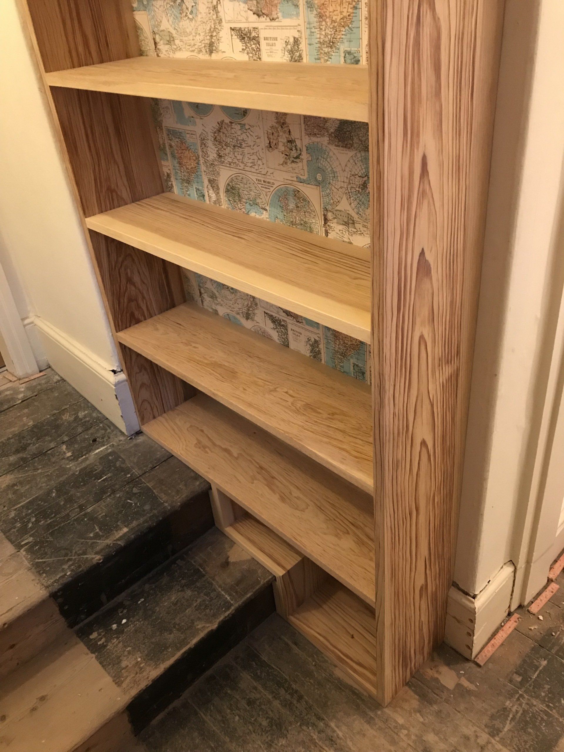 This unique book case made in Pitch Pine is a perfect example of how we can utilise space given to get the maximum storage available. It wraps around the stair treds and risers that once the carpet is fitted will look like a seamless piece of furniture.