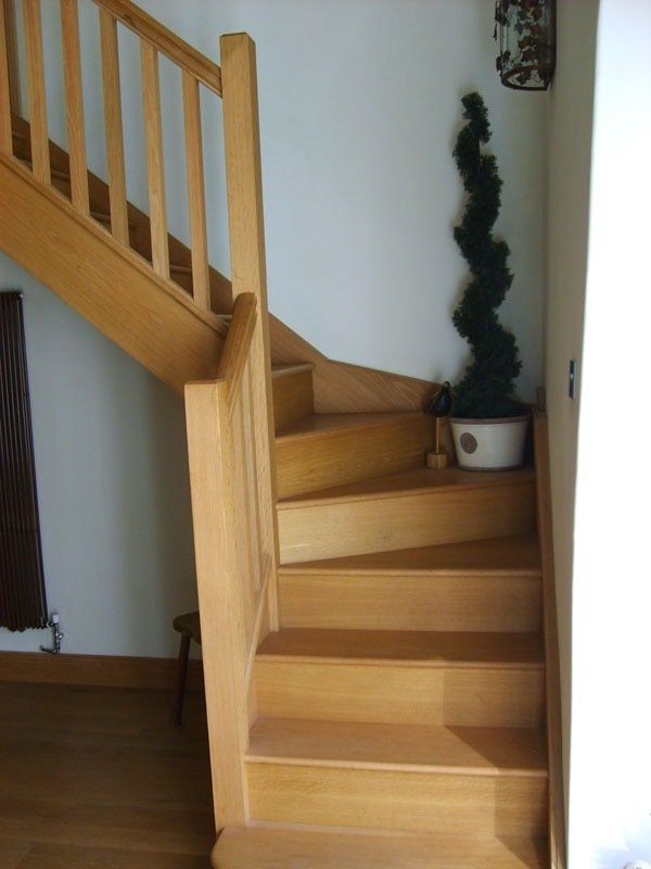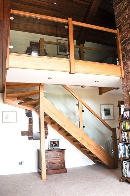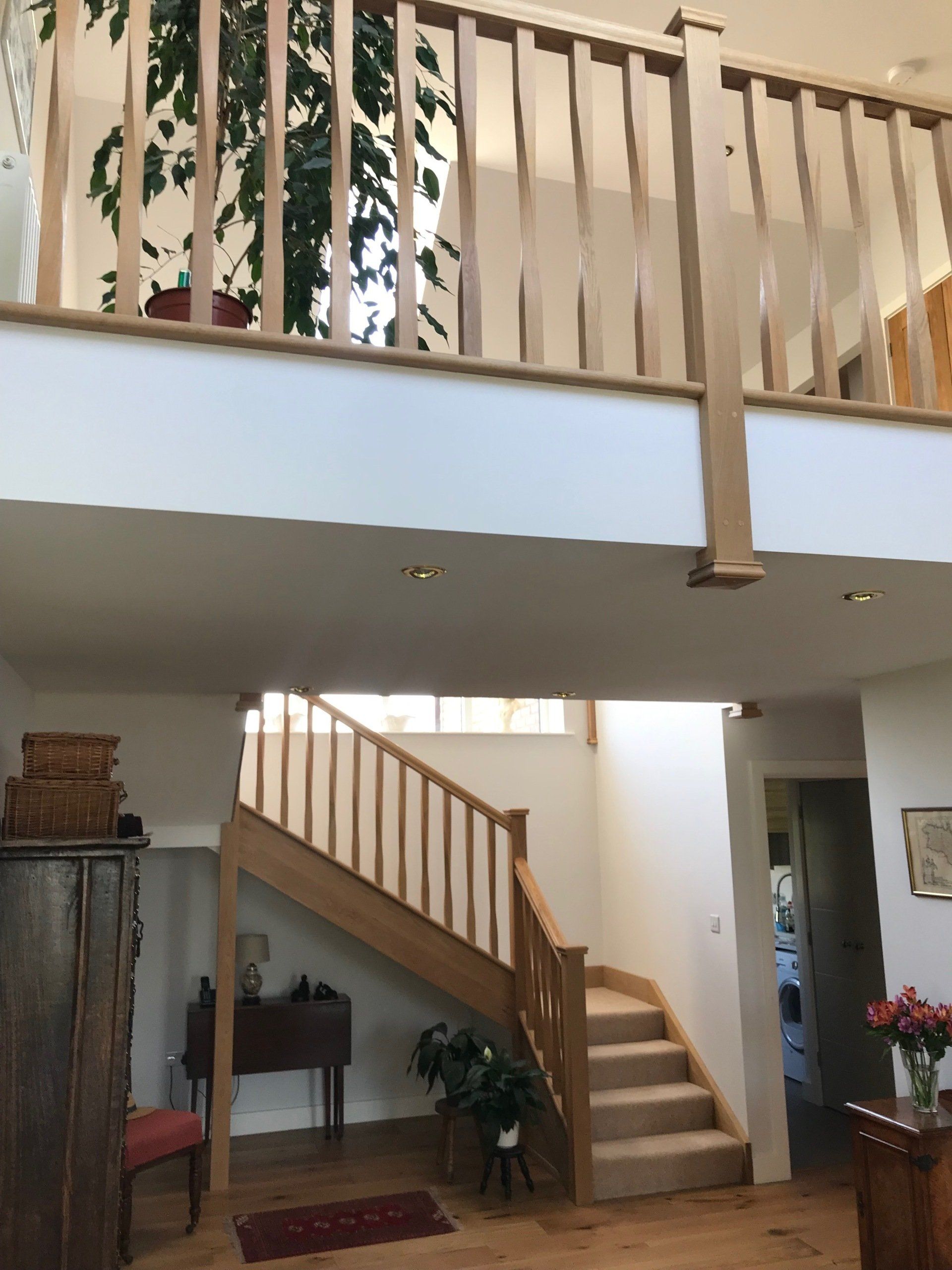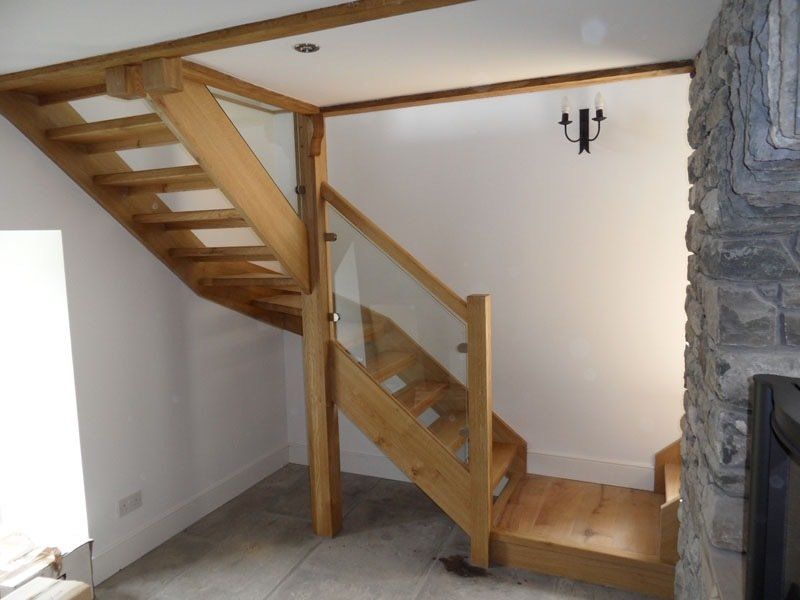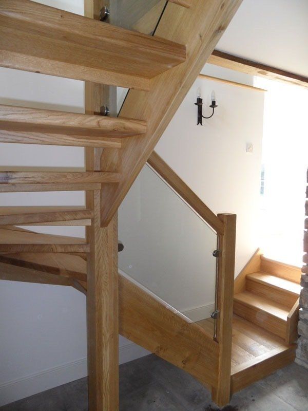 This Stunning staircase was made in European Oak. No risers were fitted to keep the "Spacious" feel of the room. The Glass inserts between Newels give the stairs a modern feel in a traditional building.