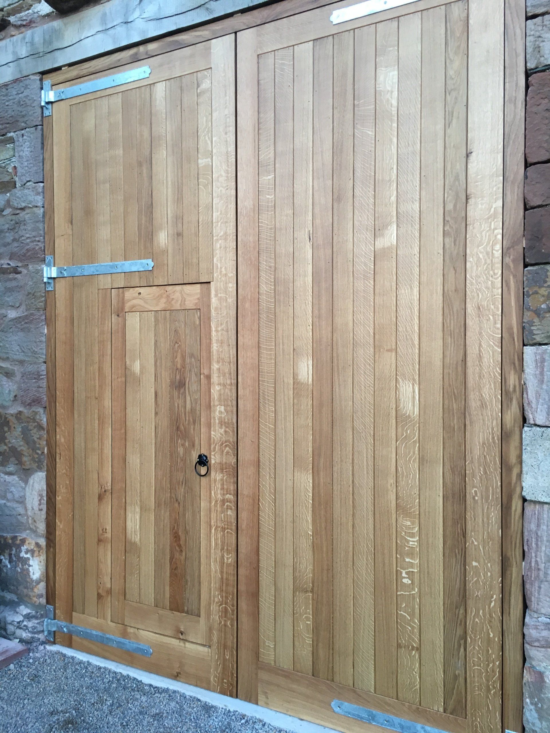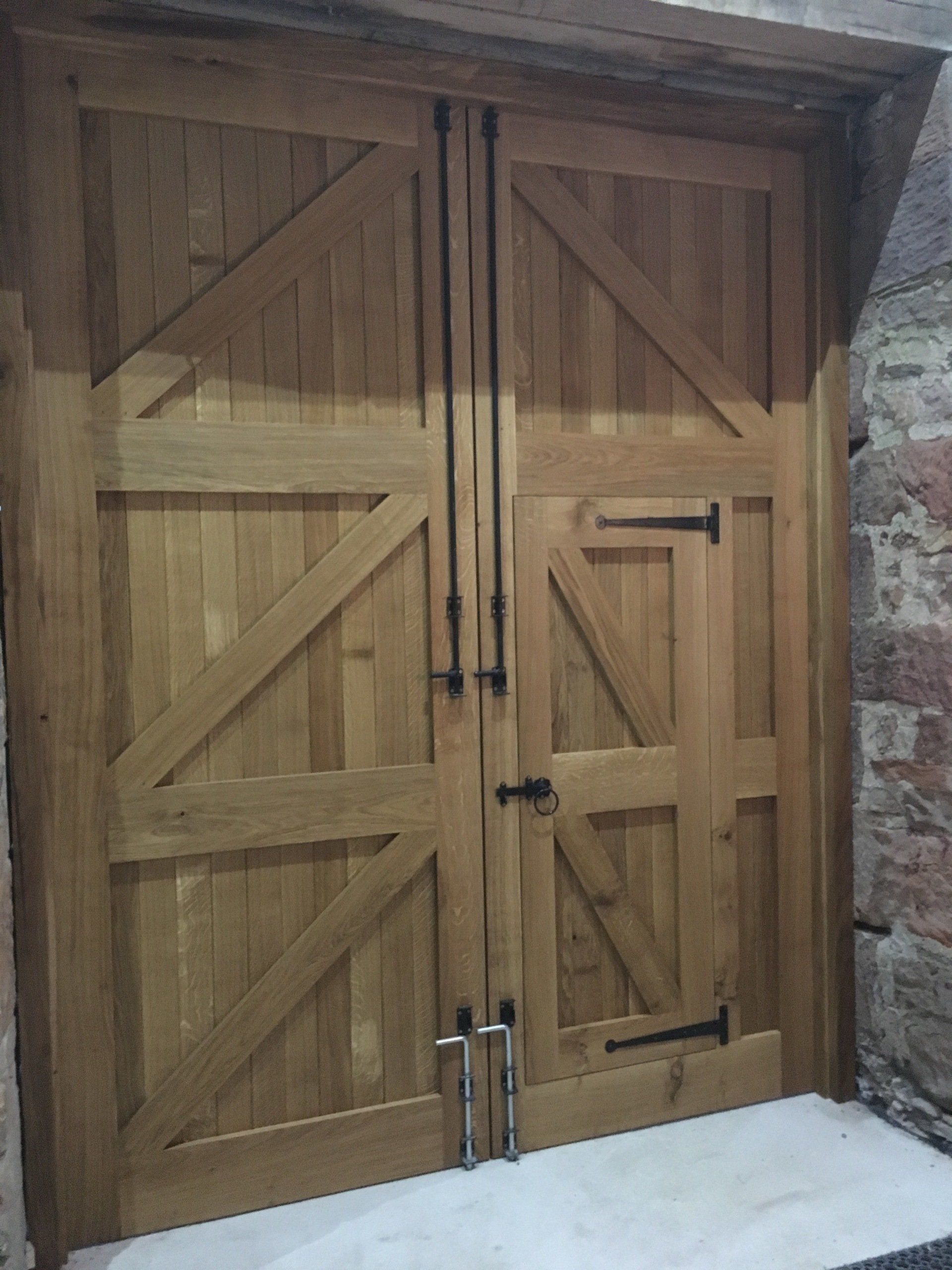 A Solid European Oak Barn Door that has an access door within one of the main doors, fitted with black antique furniture.